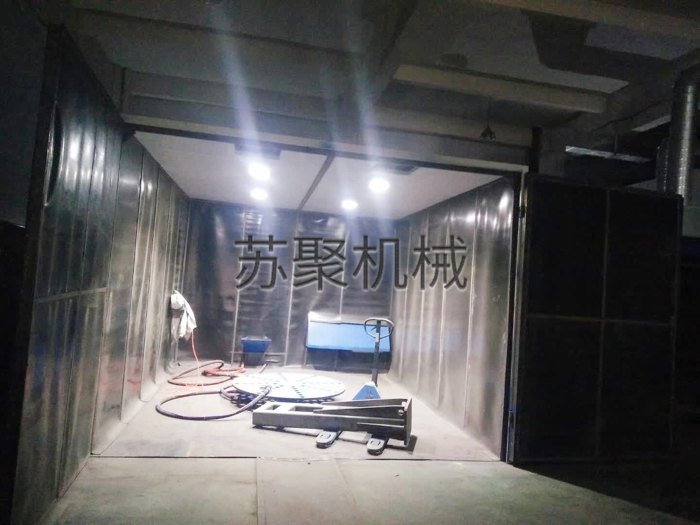 自動機械式回收噴砂(丸)房為平車往復式專用噴丸機,它由噴丸室體、噴丸器、螺旋輸送機、提升機、分離器、彈丸控制系統(tǒng)、照明系統(tǒng)、除塵系統(tǒng)、輸送平車、電控系統(tǒng)等部分組成。